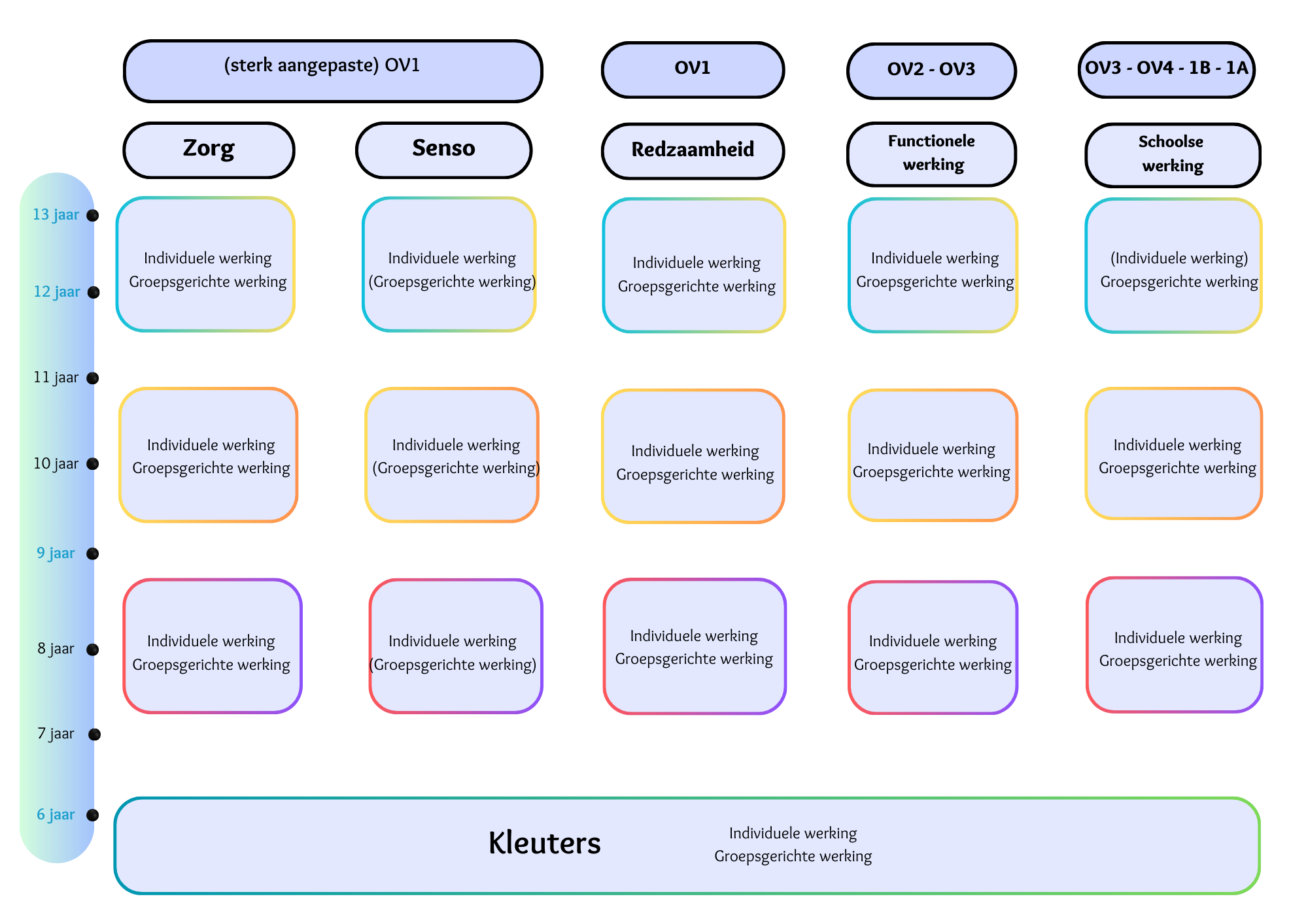 - Het leerpad van elk kind blijft flexibel. Elk jaar bekijkt het multidisciplinair team wat het beste past.