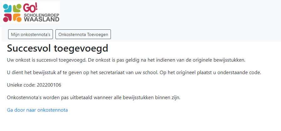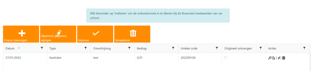 Als je dan klikt op “ga door naar onkostennota”, moet je op het volgende scherm zeker niet vergeten op de oranje knop indienen te klikken!