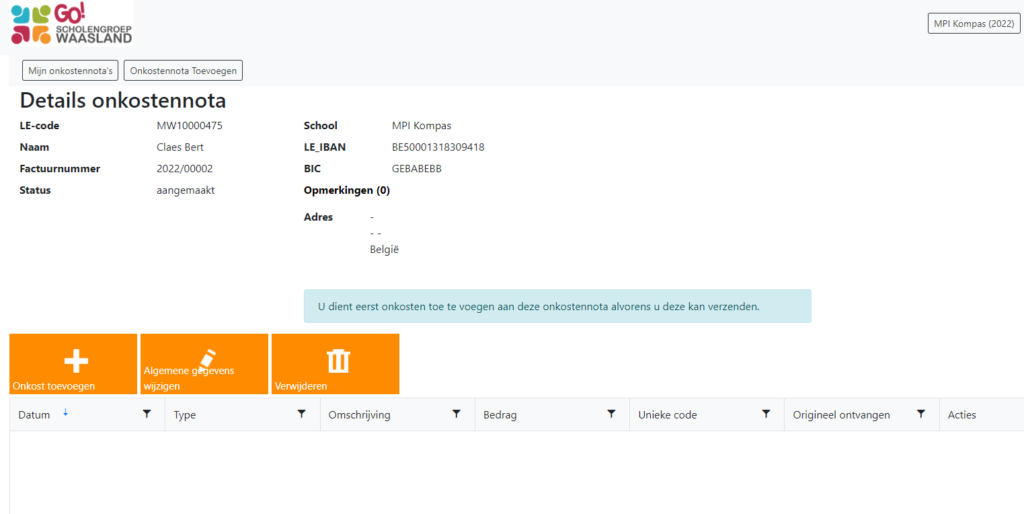 Om nieuwe onkostennota’s toe te voegen, klik je op “onkostennota toevoegen”.