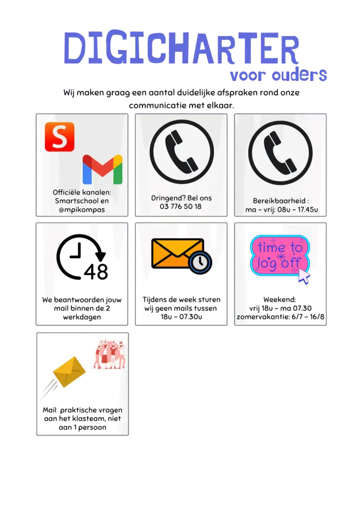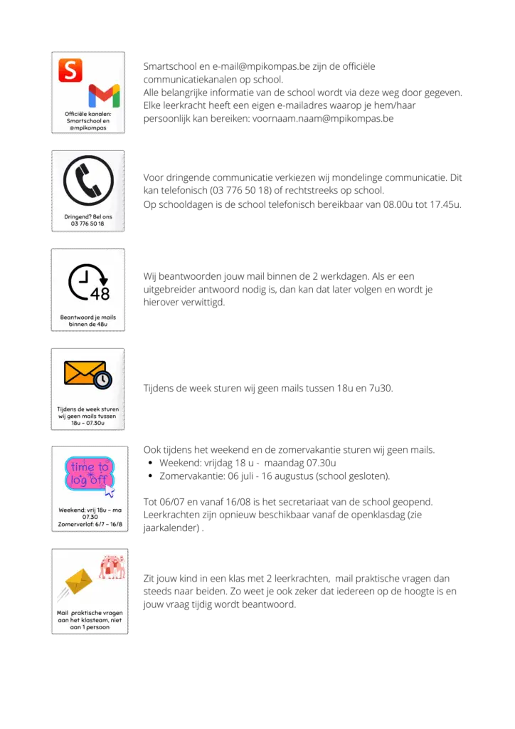 | Smartschool | – U krijgt een Smartschool-account. – Via Smartschool krijgt u belangrijke informatie van de school. – U kunt ook berichten sturen naar de leerkracht. |