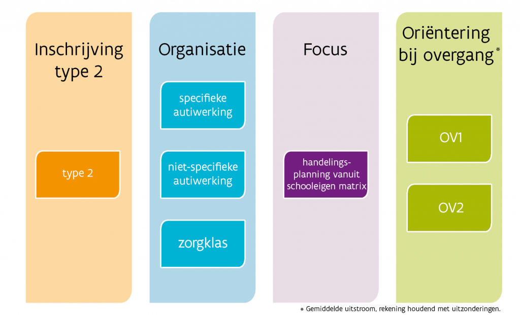 In de type 2 klassen komen communicatie, sociale vaardigheden, redzaamheid, vrije tijd, motoriek, muzische vorming, ICT, leren leren, functionele taal en gecijferdheid aan bod. Aangepaste onderwijs- vormen en -methoden dragen hiertoe bij. Dit geldt zowel voor klassen binnen de specifieke als de niet-specifieke auti-werking.